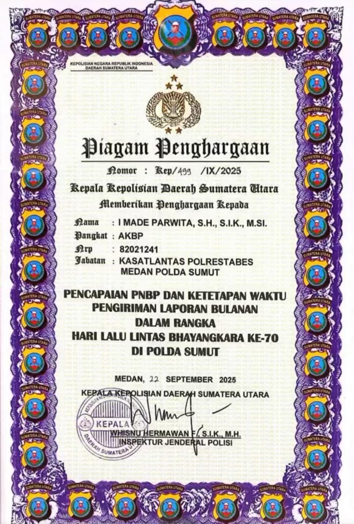Medan | SuaraPrananta.com — Kepala Kepolisian Daerah Sumatera Utara memberikan penghargaan kepada AKBP I Made Parwita atas pencapaian Penerimaan Negara Bukan Pajak (PNBP) serta ketepatan waktu pengiriman laporan bulanan oleh Satuan Lalu Lintas Polrestabes Medan, Senin (22/9/2025). Penghargaan tersebut diserahkan bertepatan dengan peringatan Hari Lalu Lintas Bhayangkara ke-70 di Polda Sumut.